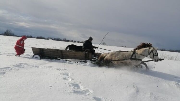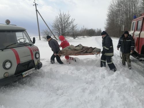На Житомирщине около села Хотыж спасатели везли больную 14-летнюю пациентку на упряжке, потому что скорая помощь просто застряла в снегу.