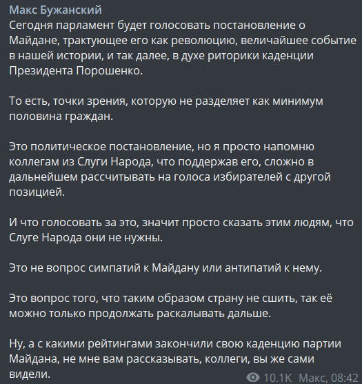 "Сегодня парламент будет голосовать постановление о Майдане, трактующее его как революцию, величайшее событие в нашей истории и так далее, в духе риторики каденции Президента Порошенко.