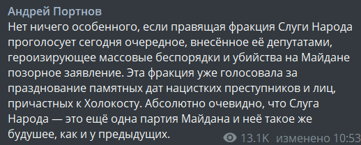 "Нет ничего особенного, если правящая фракция Слуги Народа проголосует сегодня очередное, внесённое её депутатами, героизирующее массовые беспорядки и убийства на Майдане позорное заявление. Эта фракция уже голосовала за празднование памятных дат нацистких преступников и лиц, причастных к Холокосту. Абсолютно очевидно, что Слуга Народа — это ещё одна партия Майдана и у неё такое же будущее, как и у предыдущих".