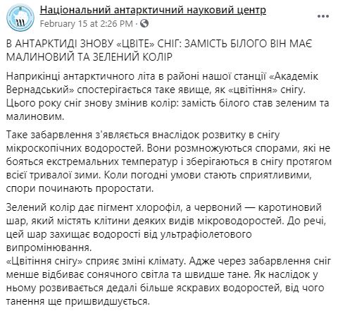 Неподалеку станции Академик Вернадский начал цвести снег, фото: facebook.com/AntarcticCenter