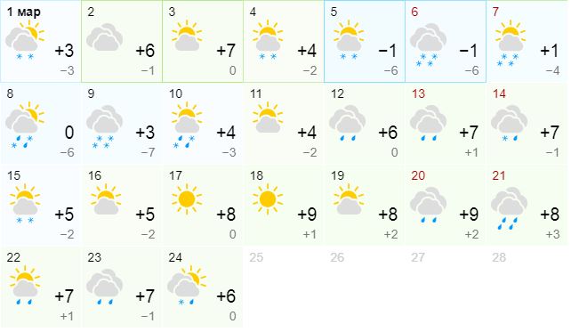 Март начнется с +10 и солнца. Такая погода продержится несколько дней, а 5-6 марта придет краткое похолодание с -3 днем и -7 ночью.