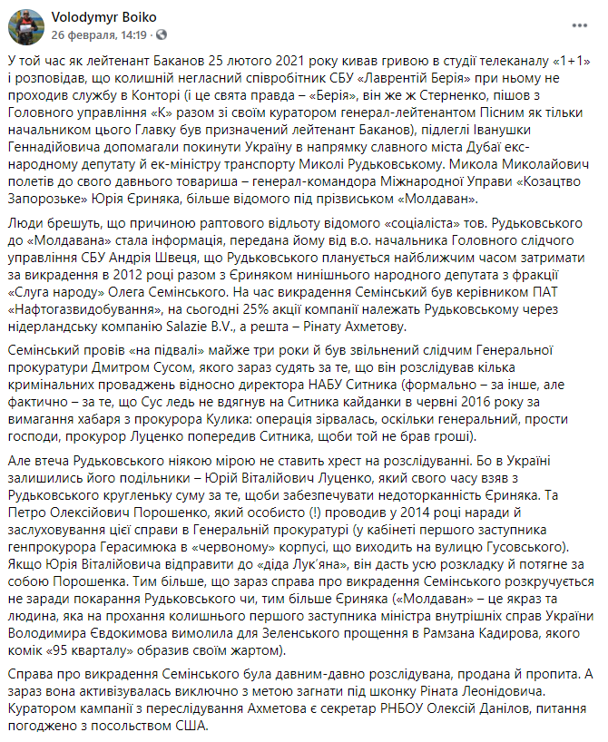 "Сейчас оно (дело о похищении Семинского - Ред.) активизировалось исключительно с целью загнать под шконку Рината Леонидовича. Куратором кампании по преследованию Ахметова является секретарь СНБО Алексей Данилов, вопрос согласован с посольством США", - пишет Бойко.