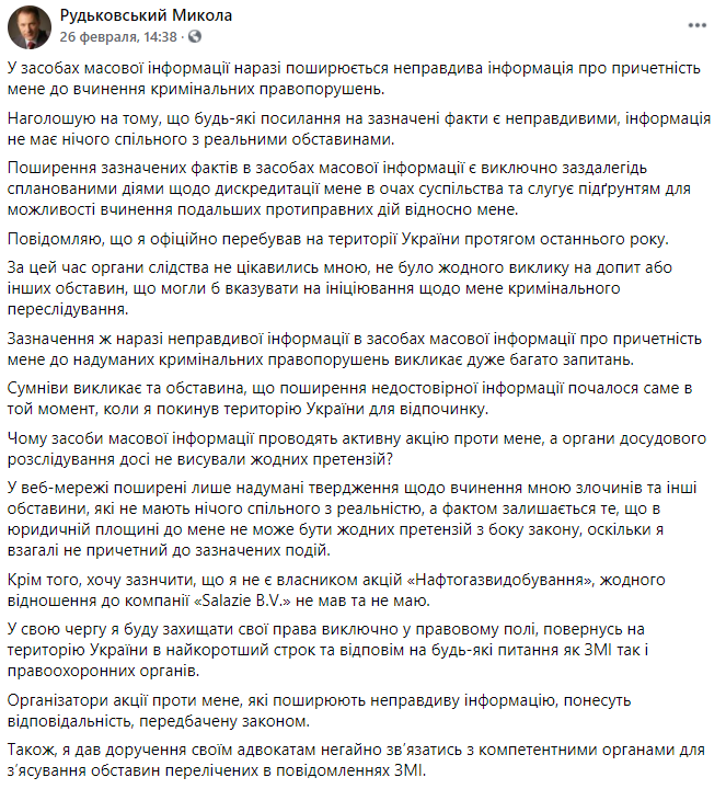 Сам же Рудьковский назвал прозвучавшие обвинения неправдивыми. Также он напомнил, что почти весь последний год находился в Украине - и никто им всё это время официально не интересовался.