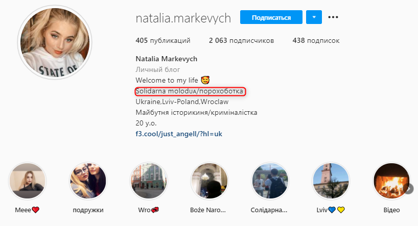 Она активно ведет свою страницу в Instagram, где не скрывает свои политические взгляды, называя себя "порохоботкой" и публикуя совместные фото с политиками - Софьей Федыной, Порошенко и его семьей, а также экс-спикером Рады Андреем Парубием.