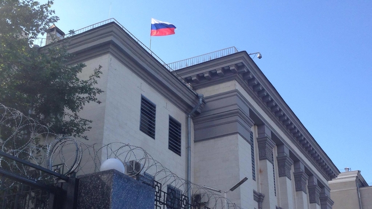 10:26 - Патрульная полиция охраняет посольство РФ в Киеве на Воздухофлостком проспекте в бронежилетах. Об этом сообщает корреспондент "Страны" с места событий. Обстановка у посольства спокойная.