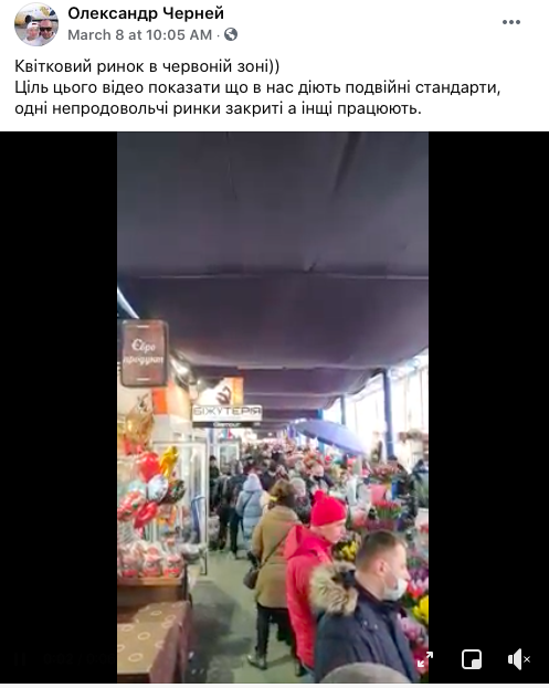 "Цветочный рынок в красной зоне)) Цель этого видео показать, что у нас действуют двойные стандарты - одни непродовольственные рынки закрыты, а другие работают", - написал Черней.