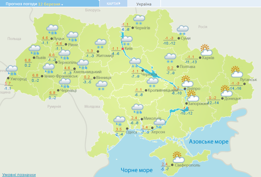 Температура ночью 4-9 градусов мороза, на левобережье - до -10-15.  В западных областях около ноля. В дневные часы от -3 до +2. На западе страны и Одесской области +3-8 градусов.