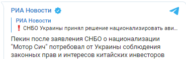 "Пекин после заявления СНБО о национализации "Мотор Сич" потребовал от Украины соблюдения законных прав и интересов китайских инвесторов", - говорится в заявлении.