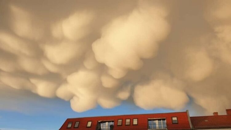 В небе над столицей Германии в течение получаса можно было наблюдать редкое природное явление - вымеобразные облака, которые образовались после грозового шторма.