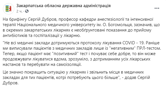"Не все медицинские учреждения придерживаются протокола лечения Covid - 19. Ранее мы выписывали пациентов из медицинских учреждений только с "негативным" ПЦР-тестом. Теперь, если пациент имеет "позитивный" тест и чувствует себя хорошо, то он может продолжать лечиться дома, понятно с соблюдением всех лекарственных установок и находиться на самоизоляции. Это значительно улучшит ситуацию в больницах и освободит места в медицинских учреждениях для тех пациентов, которые нуждаются в этом больше", - добавил Сергей Дубров.
