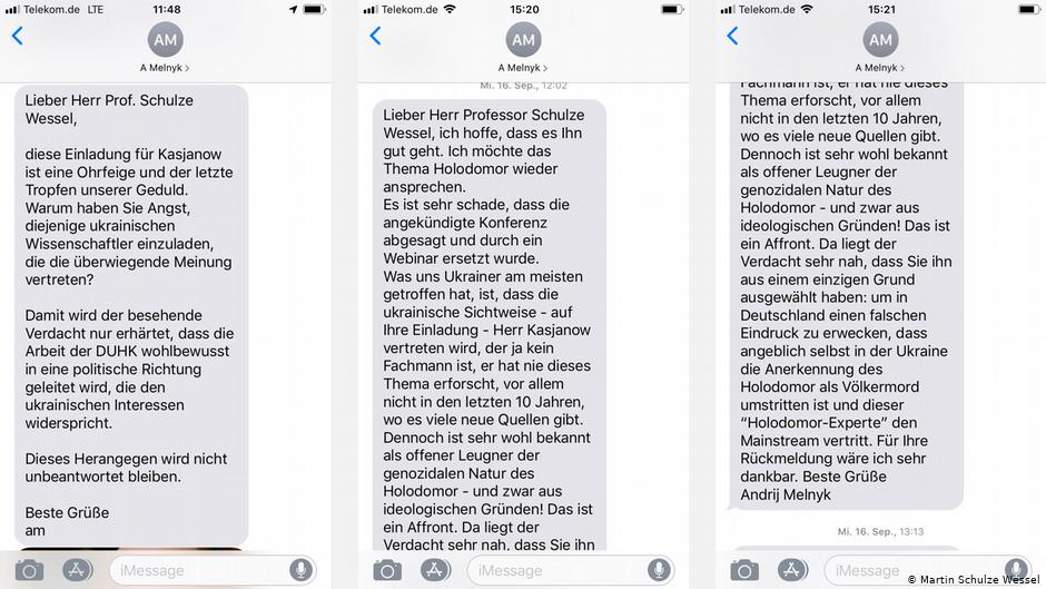 Кульминацией этой истории стали СМС Мельника, которые он отправлял немецким членам комиссии. В них он требовал не привлекать к работе украинского историка Георгия Касьянова, который известен своими умеренными взглядами на этот вопрос.