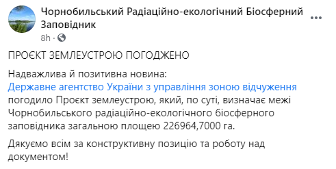Государственное агентство Украины по управлению зоной отчуждения согласовало проект землеустройства Чернобыльского заповедника.
