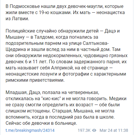 "В Подмосковье нашли двух девочек-маугли, которые жили вместе с 19-ю кошками. Их мать - неонацистка из Латвии", - говорится в сообщении.