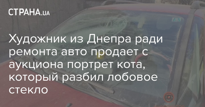 Художник из Днепра Тарас Билоус, на автомобиль которого на днях с 6-го этажа упал кот и разбил лобовое стекло, увековечил происшествие в картине и выставил ее на аукцион.
