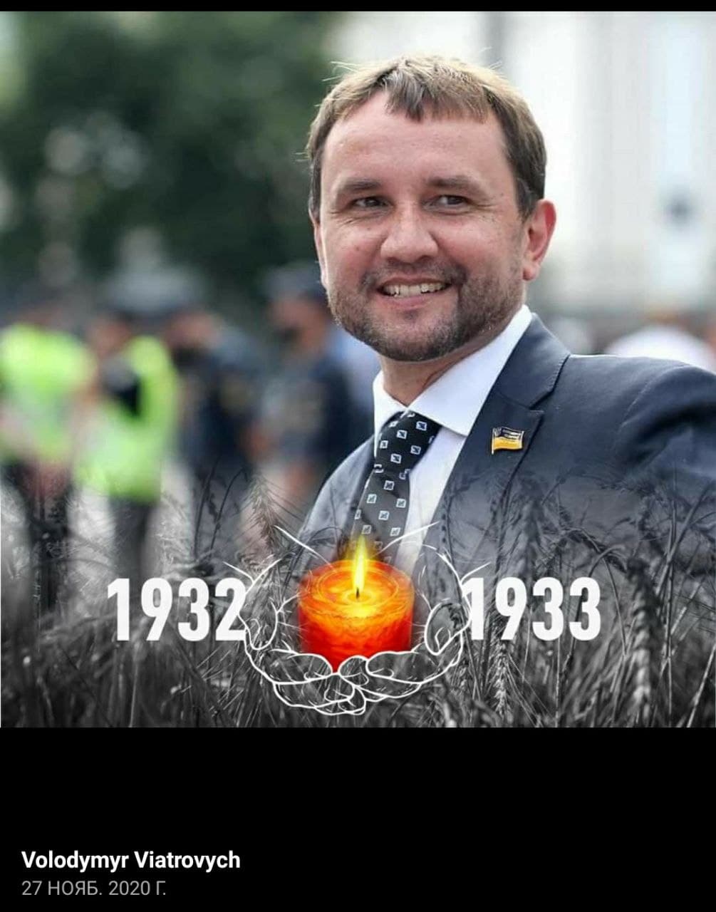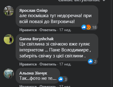 Так, пользователи обратили внимание, что на одном из фото Вятрович смеется рядом призывом зажечь свечу памяти в честь жертв Голодомора. Такую рамку Вятрович сделал как раз в памятные дни в ноябре 2019 года.