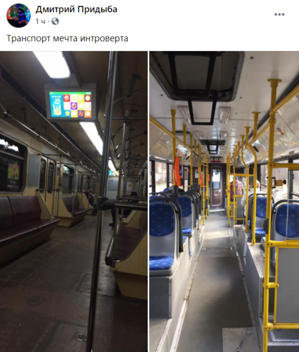 11:33 Городской транспорт едет полупустой. Пассажиры публикуют фото, называя это "мечтой интроверта". В комментариях просчитывают, сколько электричества и бензина спалят впустую.