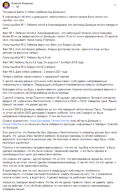 "В последнее время в информационном пространстве ОРДЛО и Российской Федерации активно распространяется информация о гибели 02.04.2021 пятилетнего ребенка и ранении женщины в частном домовладении, что находится в поселке Александровское, якобы в результате детонации взрывного устройства, сброшенного беспилотным летательным аппаратом Вооруженных Сил Украины.