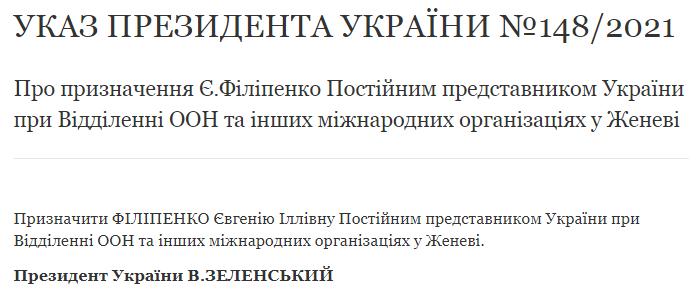 "Назначить Филипенко Евгению Ильиничну Постоянным представителем Украины при Отделении ООН и других международных организациях в Женеве", - говорится в документе.