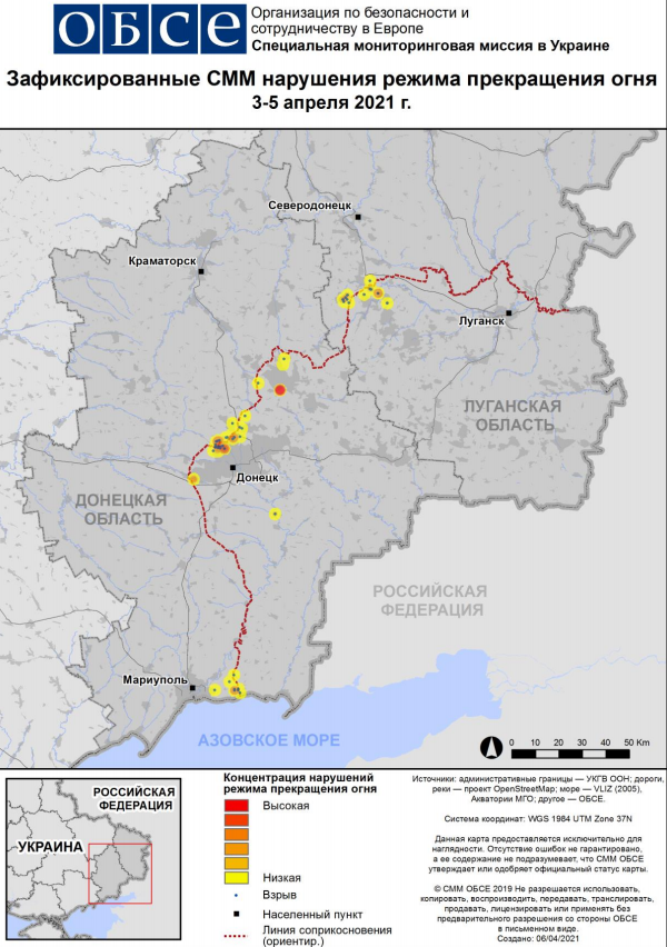 "С вечера 2-го по вечер 5 апреля в Донецкой области Миссия зафиксировала 1424 нарушения режима прекращения огня. За предыдущий отчетный период в этой области зафиксировано 594 таких нарушения", – говорится в отчете, который вышел вчера вечером.