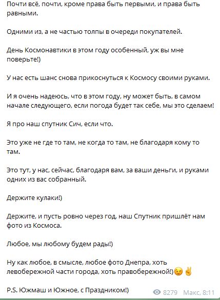 Я про наш спутник Сич, если что. Это уже не где-то там, не когда-то там, не благодаря кому-то там. Это тут, у нас, сейчас, благодаря вам, за ваши деньги, и руками одних из вас собранный. Держите кулаки!) Держите, и пусть ровно через год, наш Спутник пришлёт нам фото из Космоса.