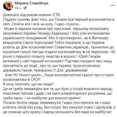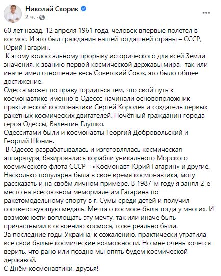 "Полет Юрия Гагарина был Победой всего Советского Союза и Украины, которая тоже внесла свой весомый вклад. Мир радовался успеху СССР. Стыдно слышать как псевдопатриоты порочат историю, сеют ненависть и вражду между народами", - пишет блогер Владимир Колесниченко.
