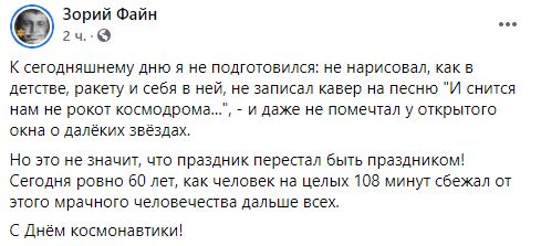 Но это не значит, что праздник перестал быть праздником! Сегодня ровно 60 лет, как человек на целых 108 минут сбежал от этого мрачного человечества дальше всех. С Днём космонавтики!" - написал фотохудожник Зорий Файн.