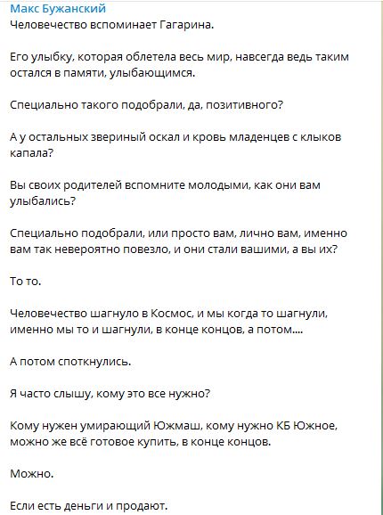 "Человечество вспоминает Гагарина. Его улыбку, которая облетела весь мир, навсегда ведь таким остался в памяти, улыбающимся. Специально такого подобрали, да, позитивного? А у остальных звериный оскал и кровь младенцев с клыков капала? Вы своих родителей вспомните молодыми, как они вам улыбались? Специально подобрали, или просто вам, лично вам, именно вам так невероятно повезло, и они стали вашими, а вы их? То то.
