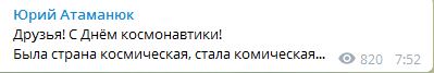 "Друзья! С Днём космонавтики! Была страна космическая, стала комическая..." - написал экономический эксперт Юрий Атаманюк.