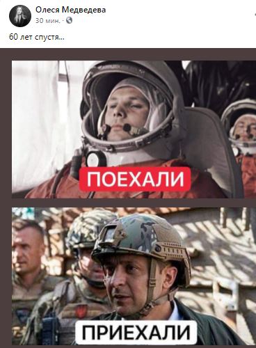 "60 лет спустя..." - опубликовала фото Гагарина и Зеленского спецкор "Страны" Олеся Медведева.
