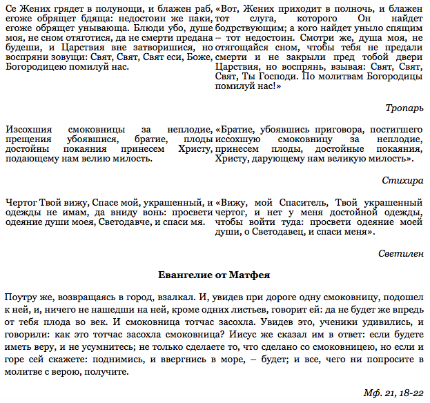 Молитвы и пост. Богослужения в этот день посвящены притчам и наставлениям, которые давал Иисус в Иерусалимском храме. Дома можно читать следующие песнопения и отрывки из Евангелия.