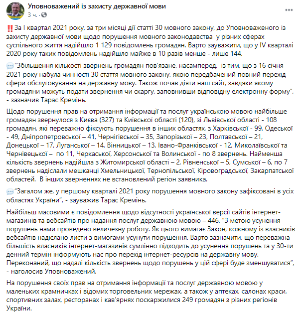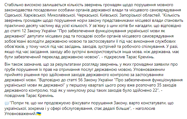 1 129 сообщений о нарушении языкового законодательства в различных сферах общественной жизни получил мовный омбудсмен Тарас Креминь за три месяца действия ст. 30 закона "Об обеспечении функционирования украинского языка как государственного". Об этом сообщается на странице уполномоченного по защите государственного языка в соцсети.