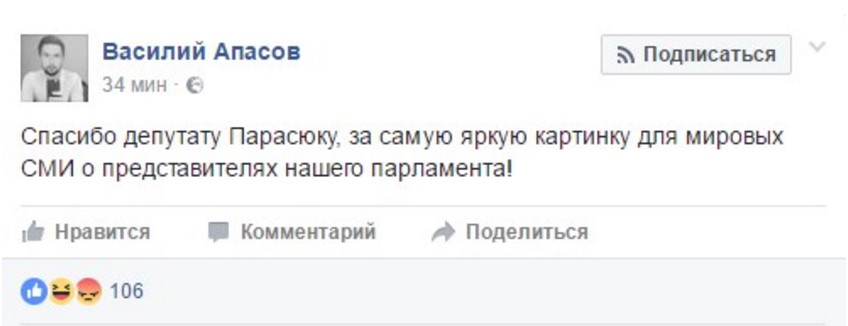 "Спасибо депутату Парасюку, за самую яркую картинку для мировых СМИ о представителях нашего парламента!", - написал Василий Апасов.
