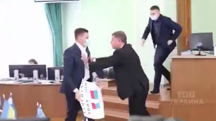В пятницу, 23 апреля, в Херсонском облсовете произошла стычка после того, как представитель "Евросолидарности" Сергей Хлань попытался сорвать выступление лидера областной организации "Оппоплатформы" Егора Устинова.