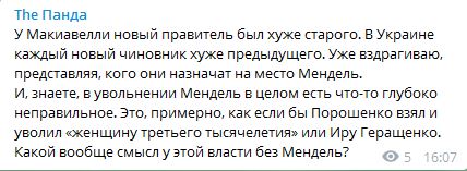 "У Макиавелли новый правитель был хуже старого. В Украине каждый новый чиновник хуже предыдущего. Уже вздрагиваю, представляя, кого они назначат на место Мендель.