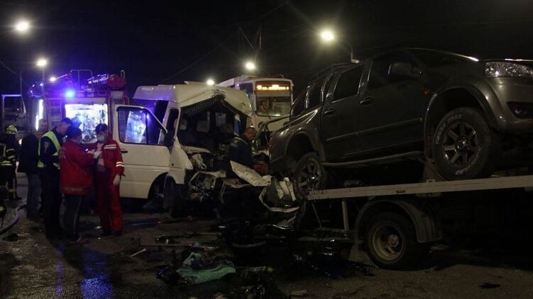В Днепре на Кайдакском мосту маршрутка "Днепр-Харьков" столкнулась с эвакуатором, который в этот момент грузил автомобиль. Из-за удара погиб водитель маршрутки-микроавтобуса.