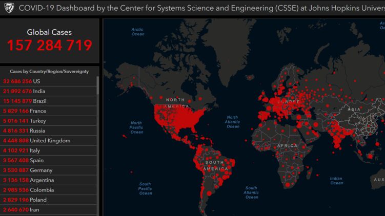 По состоянию на утро 9 мая, число зараженных в мире перевалило за 157 миллионов, фото: arcgis.com