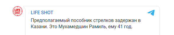 "Предполагаемый пособник стрелков задержан в Казани. Это Мухамедшин Рамиль, ему 41 год", - говорится в сообщении.