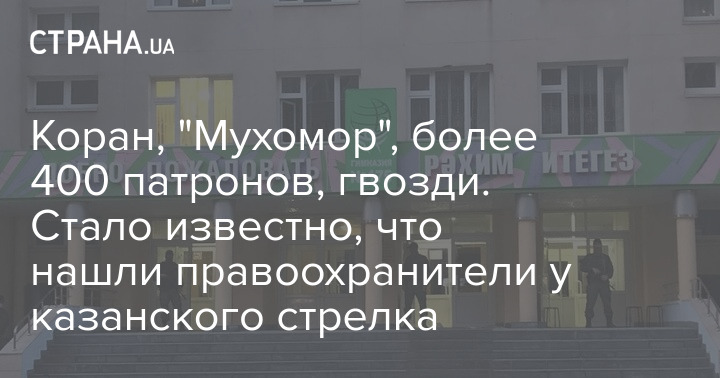 После стрельбы в казанской школе, где погибли восемь детей и учительница, на месте происшествия у стрелявшего 19-летнего Ильназа Галявиева были обнаружены более 400 патронов, нож, а дома у него нашли бутылку с настойкой лекарства "Мухомор", "Коран" и другие вещи.