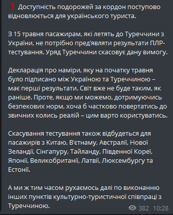 С 15 мая пассажирам, которые летят в Турцию из Украины, не нужно предъявлять результаты ПЦР-теста. Правительство Турции отменяет данное требование.