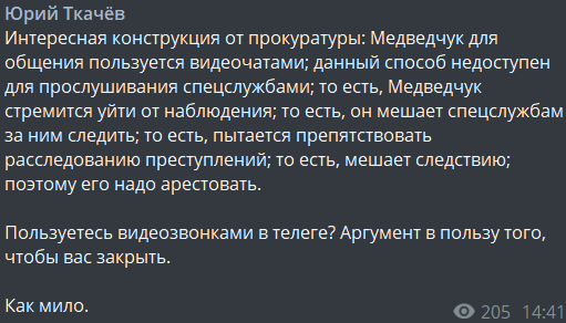 "Интересная конструкция от прокуратуры: Медведчук для общения пользуется видеочатами; данный способ недоступен для прослушивания спецслужбами; то есть, Медведчук стремится уйти от наблюдения; то есть, он мешает спецслужбам за ним следить; то есть, пытается препятствовать расследованию преступлений; то есть, мешает следствию; поэтому его надо арестовать.