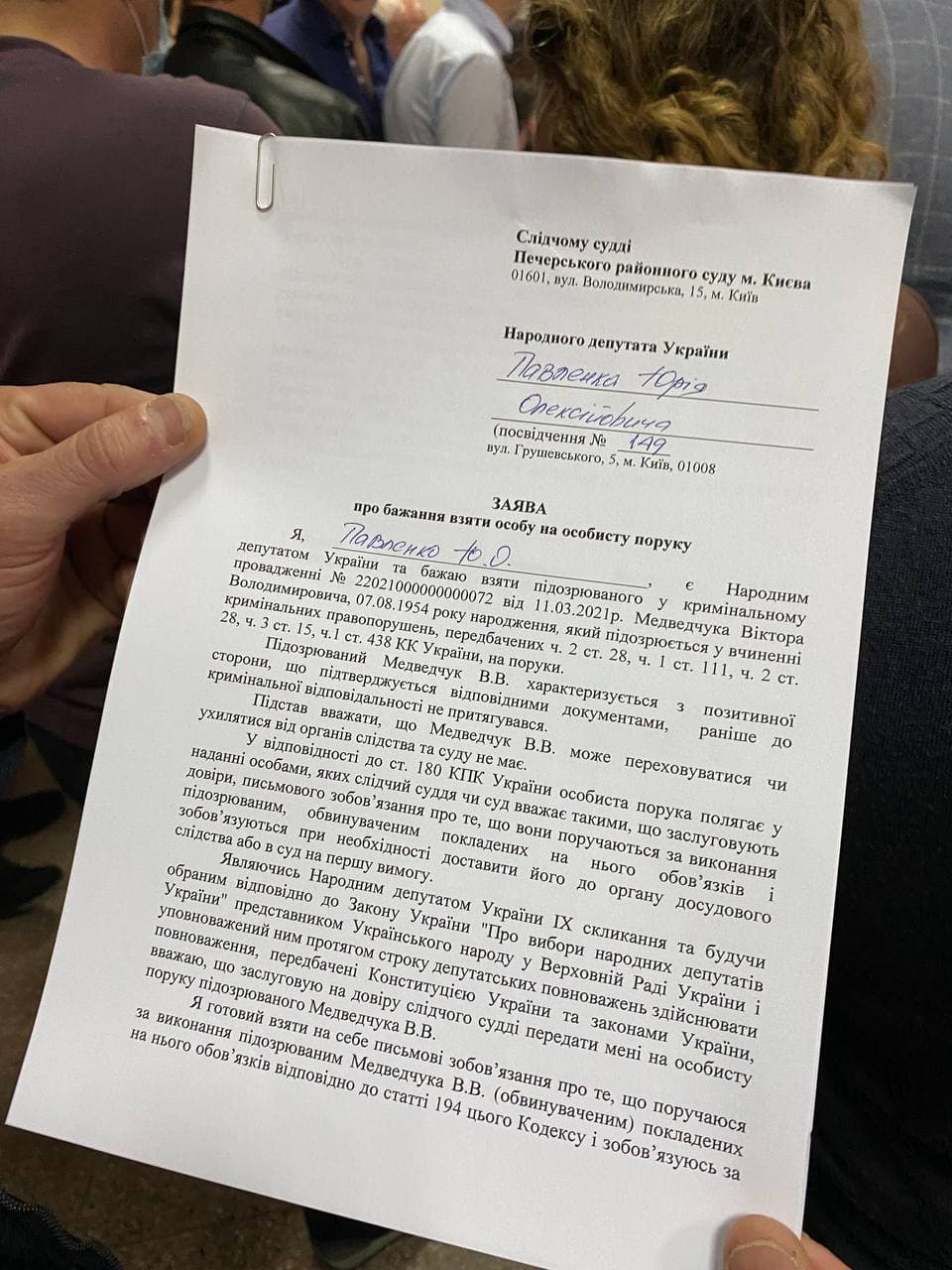 13:28  У Медведчука подали ходатайство о приобщении к заседанию документов. Судья удовлетворил. Также есть ходатайства о взятии нардепа на поруки.