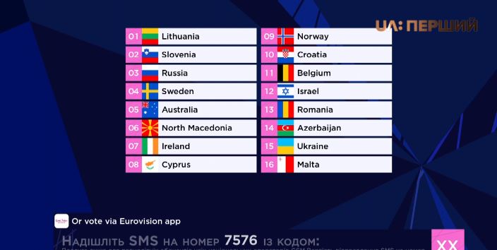 Сегодня выступали в таком прядке: Литва, Словения, Россия, Швеция, Австралия, Северная Македония, Ирландия, Кипр, Норвегия, Хорватия, Бельгия, Израиль, Румыния, Азербайджан, Украина, Мальта.