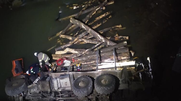 На Прикарпатье грузовик - лесовоз рухнул в реку. Два человека погибли. Фото