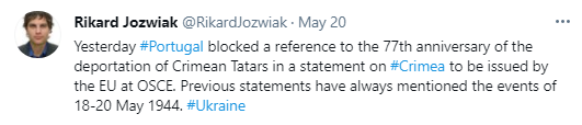 "Вчера Португалия заблокировала память 77-й годовщины депортации крымских татар в заявлении ЕС по Крыму, которое будет сделано ЕС в ОБСЕ. В предыдущих заявлениях всегда упоминались события 18-20 мая 1944 года", - написал корреспондент "Радио Свобода" Рикард Джозвяк в своем Twitter в четверг, 20 мая.
