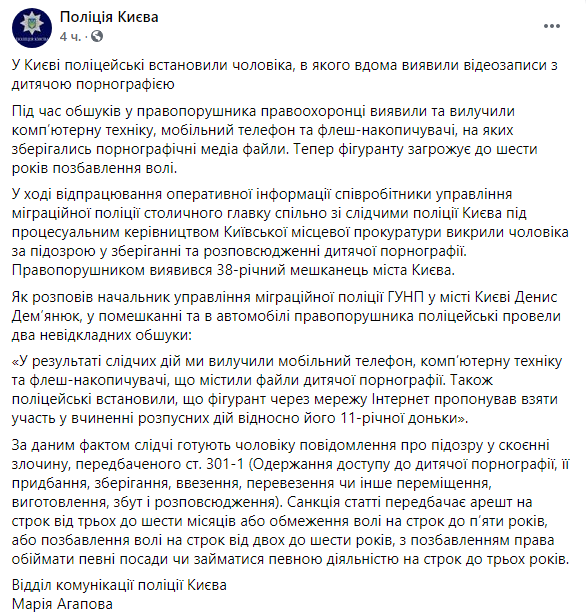 "В ходе отработки оперативной информации сотрудники управления миграционной полиции столичного главка совместно со следователями полиции Киева под процессуальным руководством Киевской местной прокуратуры разоблачили мужчину по подозрению в хранении и распространении детской порнографии. Правонарушителем оказался 38-летний житель города Киева", - заявили в пресс-центре.
