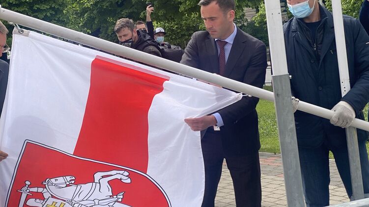 Вместе с министром иностранных дел Латвии Эдгаром Ринкевичем он снял государственный флаг Беларуси с флагштока в центре города, где развеваются флаги стран - участниц спортивного состоязания, и повесил оппозиционное знамя.