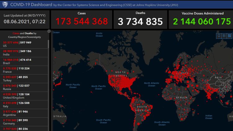 По данным на 8 июня, число зараженных на Земле приближается к 174 миллионам, фото: arcgis.com