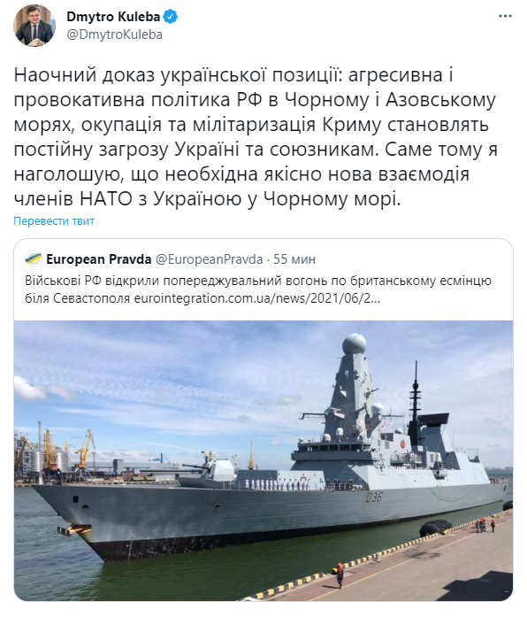 На инцидент с обстрелом силами ВМС РФ британского эсминца Defender у берегов аннексированного Крыма отреагировал министр иностранных дел Украины Дмитрий Кулеба. По его словам, Украина нуждается в качественно новом взаимодействии с членами НАТО в Черном море. Об этом он написал в своем микроблоге в Twitter.
