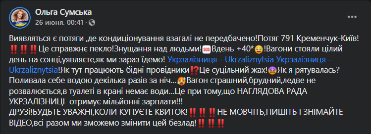 "Оказывается, есть поезда, где кондиционирование вообще не предусмотрено! Поезд 791 Кременчуг — Киев. Это сущий ад! Днем +40. Вагоны стояли целый день на солнце, представляете, как мы сейчас едем! Как здесь работают бедные проводники? Это сплошной ужас! Как я спасалась? Поливала себя водой несколько раз за ночь. Друзья, будьте внимательны, когда покупаете билет!" — подписала Сумская своё видео.