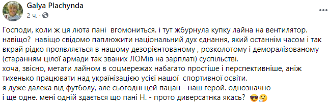 Но нет, вместо того, чтобы заниматься совершенствованием украинского спортивного образования (в том числе и в плане языка) госпоже Ницой нужно добавить ложку дегтя в бочку меда и обосрать победу национальной сборной и дальше продолжать разъединять страну и делить украинцев", - написал пост экс-нардеп Игорь Мосийчук.